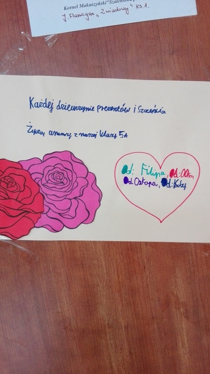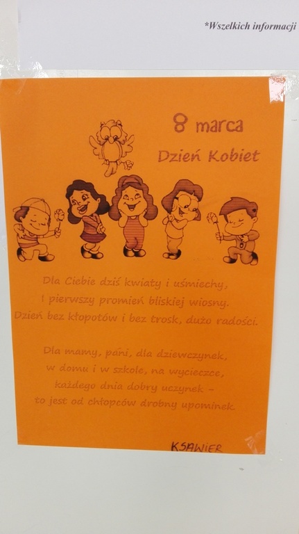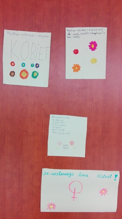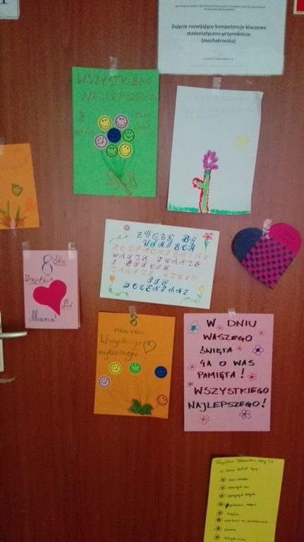 Męska część naszej szkoły nie zapomniała o Dniu Kobiet. Na drzwiach wielu sal lekcyjnych pojawiły się życzenia dla kobiet małych i dużych.