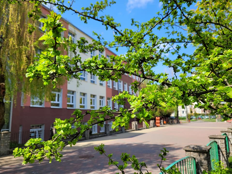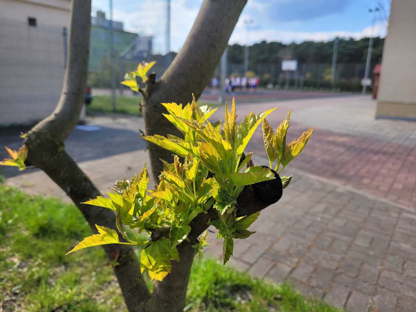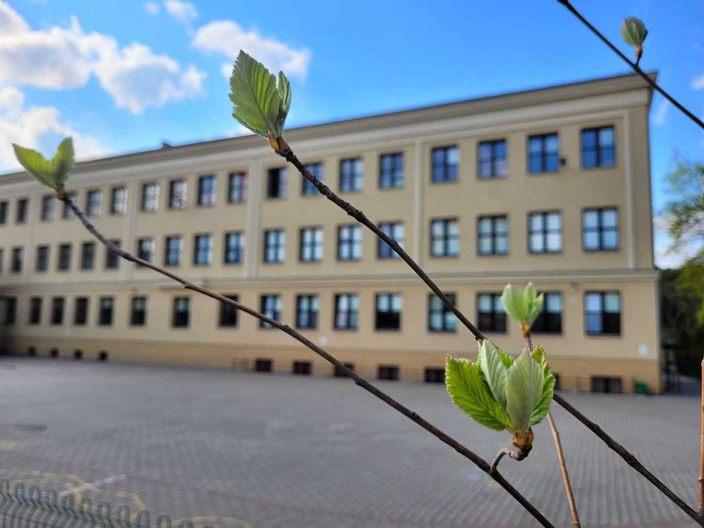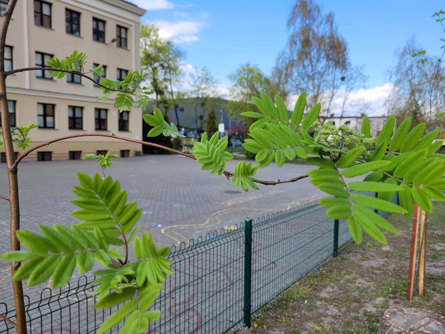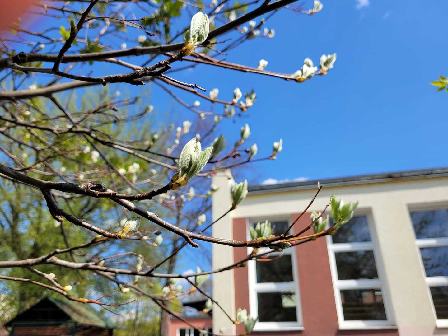 Wiosenne spojrzenie na naszą szkołę, robi się zielono, wyłażą pączusie, kwitnie młoda lipa, zalążki mają jarzębiny. Jest coraz piękniej!