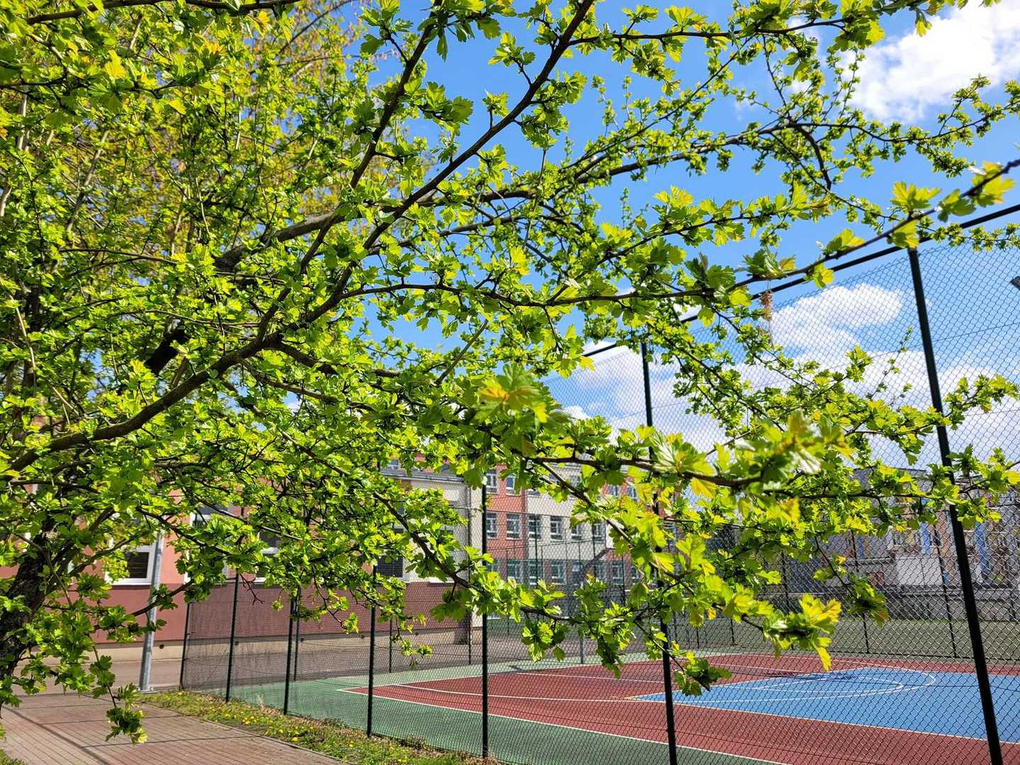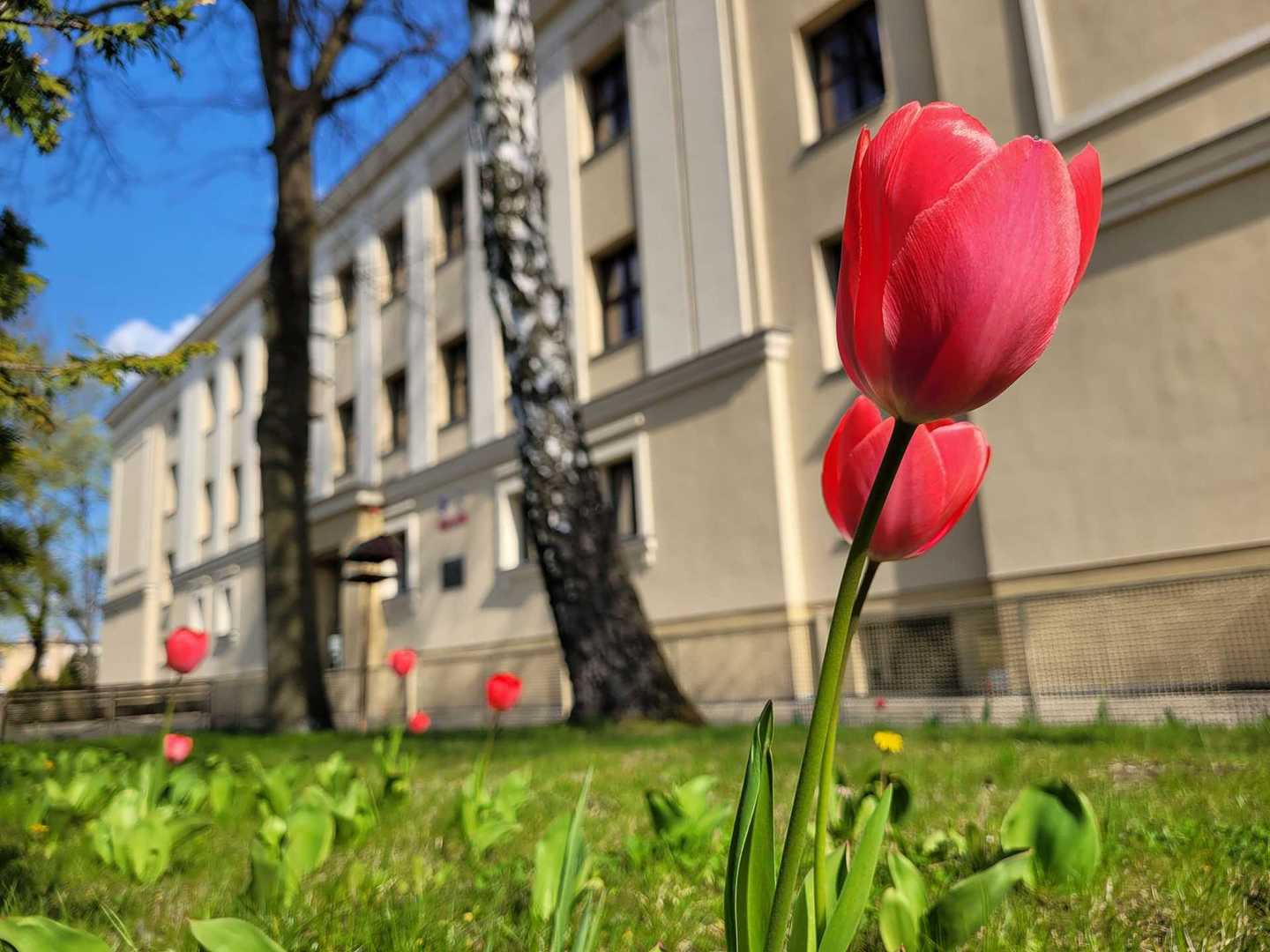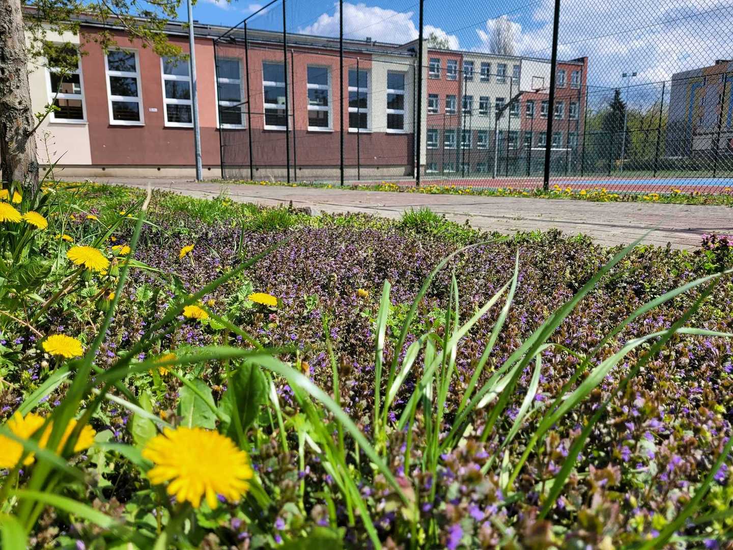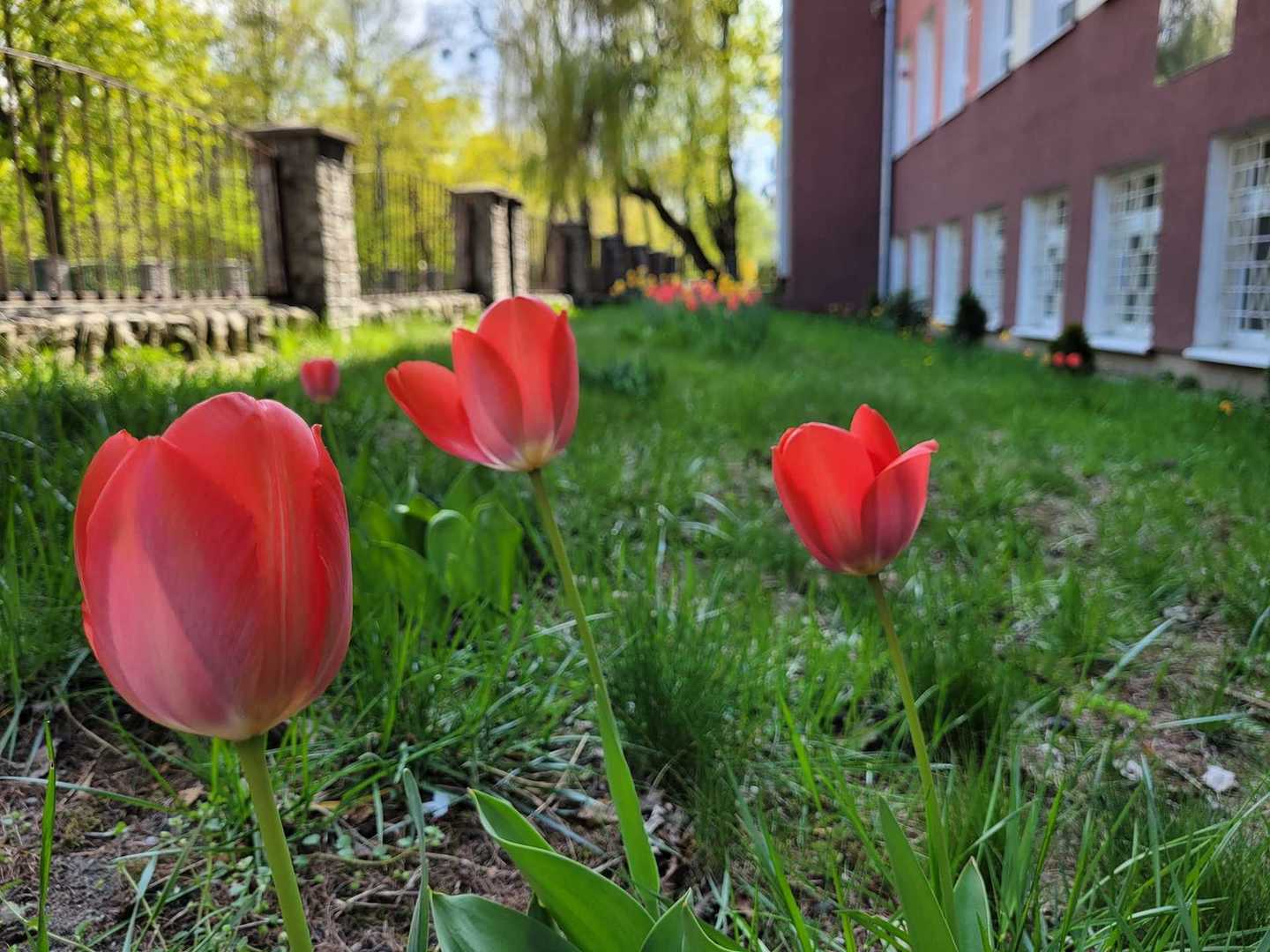 Wiosenne spojrzenie na naszą szkołę, robi się zielono, wyłażą pączusie, kwitnie młoda lipa, zalążki mają jarzębiny. Jest coraz piękniej!