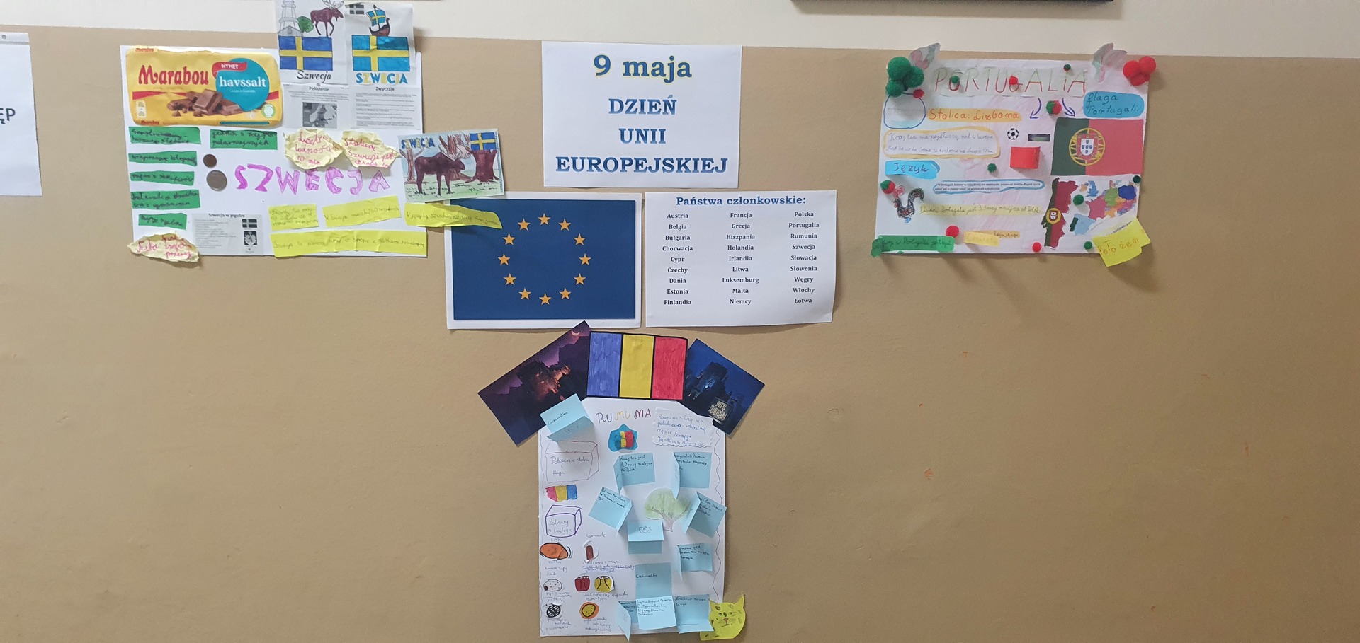 9 maja w naszej szkole obchodziliśmy Dzień Unii Europejskiej. Uczniowie klas młodszych brali udział w losowaniu nazw państw członkowskich. Następnie ich zadaniem było wykonanie plakatów dotyczących wylosowanych państw. Na wszystkich pracach znalazły się bardzo ciekawe informacje. Dodatkowo uczniowie uczestniczyli w ciekawych zajęciach dotyczących Unii Europejskiej, przygotowanych przez wychowawczynie klas.