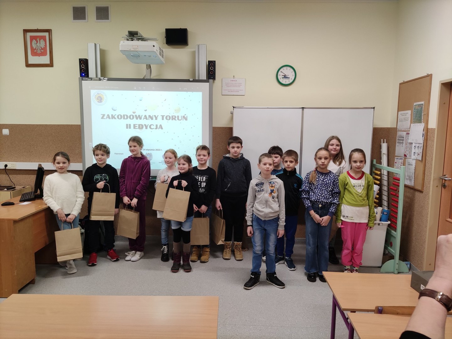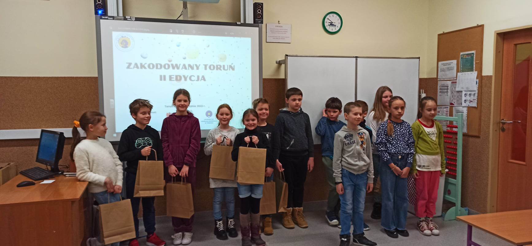 W dniu 24 stycznia 2023 r. odbyła się II edycja międzyszkolnego konkursu dla uczniów kl. II i III “Zakodowany Toruń”. Konkurs był pod patronatem Marszałka Województwa Kujawsko-Pomorskiego, Prezydenta Miasta Torunia oraz Uniwersytetu Mikołaja Kopernika w Toruniu. Nagrody w konkursie zapewniło Planetarium w Toruniu. Uczniowie w trzyosobowych zespołach musieli rozwiązać pięć zadań dotyczących odszyfrowywania tekstu, zakodowania drogi Ozobota oraz robota Minda, przejścia kolejnych etapów w grze Lightbot oraz symetrii. Uczniowie świetnie sobie poradzili z zadaniami. Ostatecznie I miejsce zajęli uczniowie z kl. II ze Szkoły Podstawowej w Grębocinie, II miejsce - uczniowie z kl. III ze Szkoły Podstawowej Nr 7, a III miejsce - uczniowie z kl. III ze Szkoły Podstawowej Nr 13. Koordynatorami konkursu były Anna Krygier i Anna Sak, a pomocy podczas realizacji zadań udzielił Łukasz Dernoga.