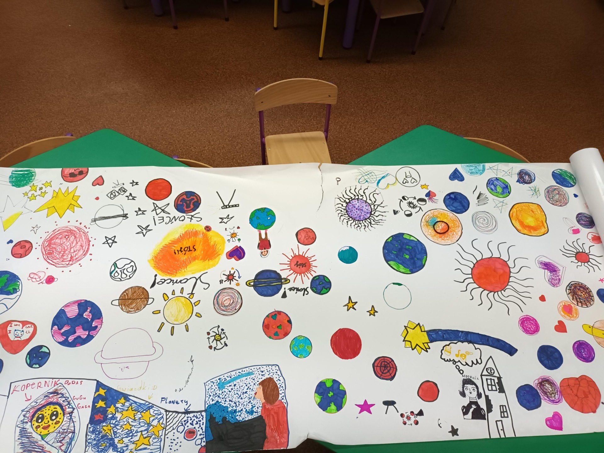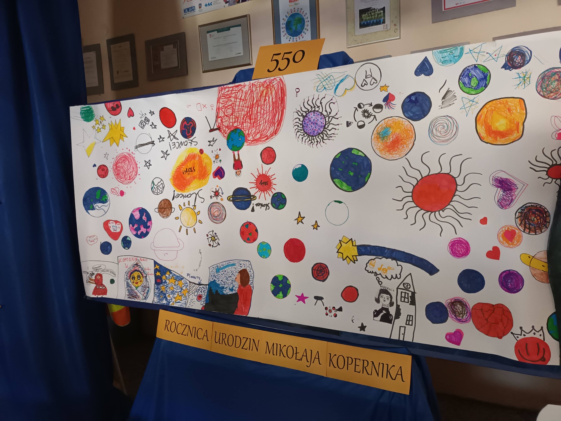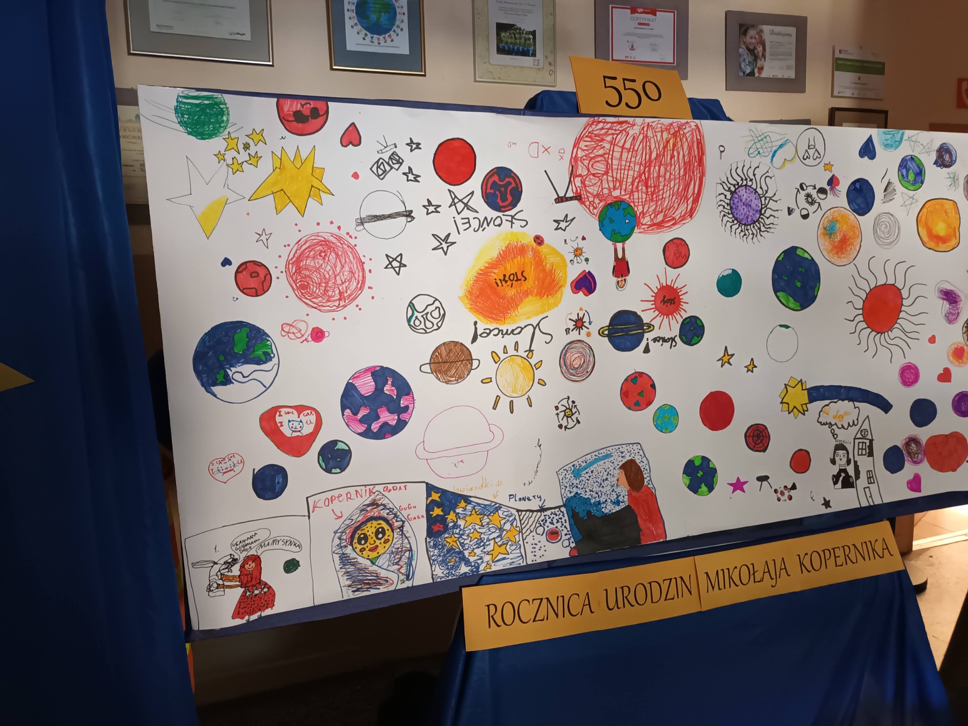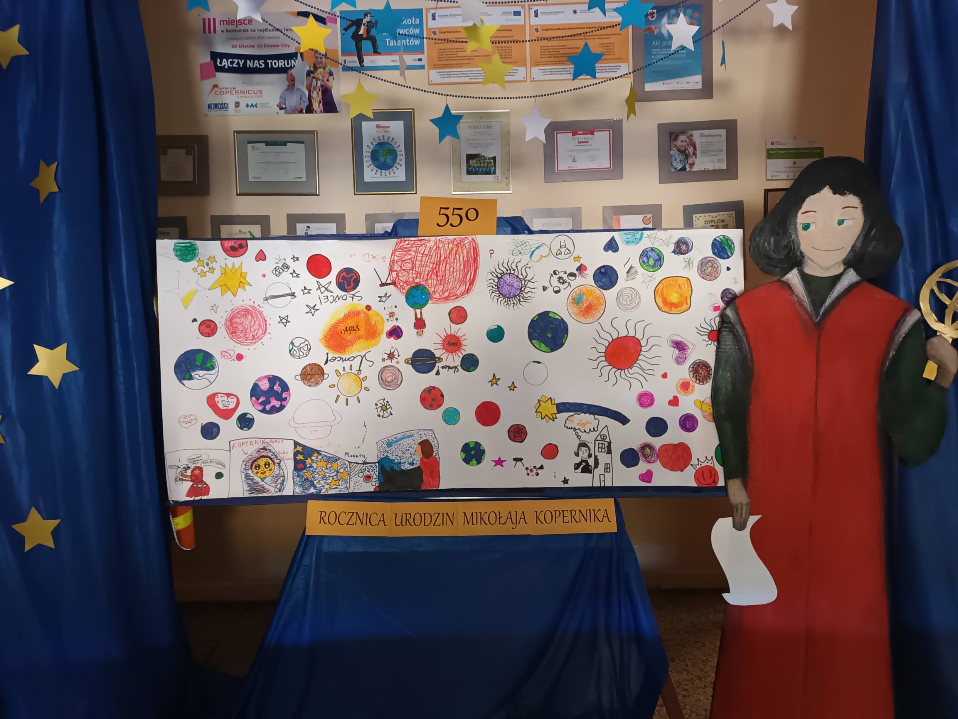 550 rocznicę urodzin naszego patrona świetliczanie uczcili różnymi działaniami - wykonaliśmy medale z plasteliny, scenografię na przedstawienie, prace plastyczne o patronie, wielki komiks o Mikołaju Koperniku oraz dekorację sali - kosmiczne pierniki.