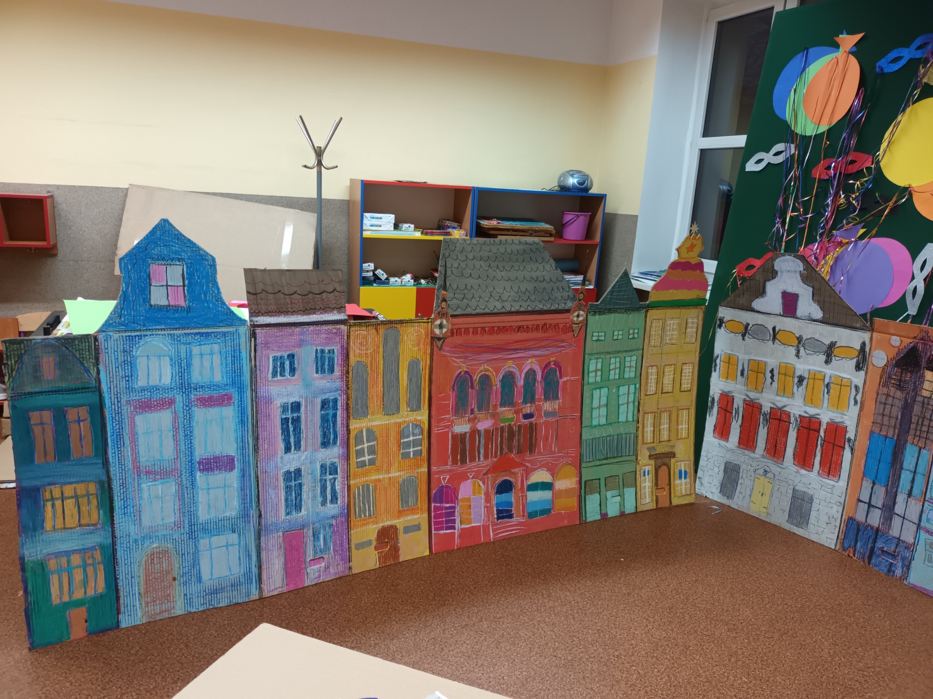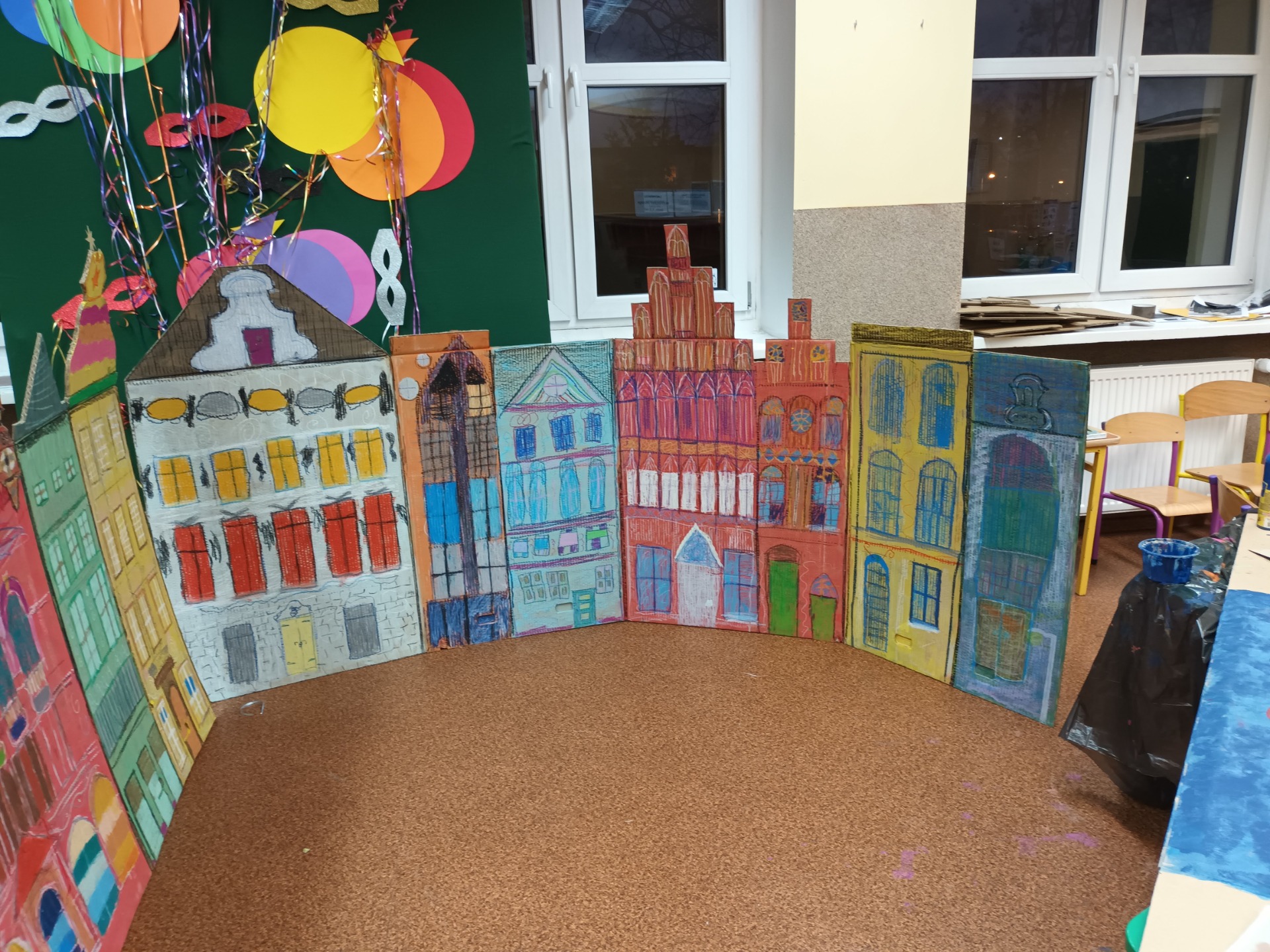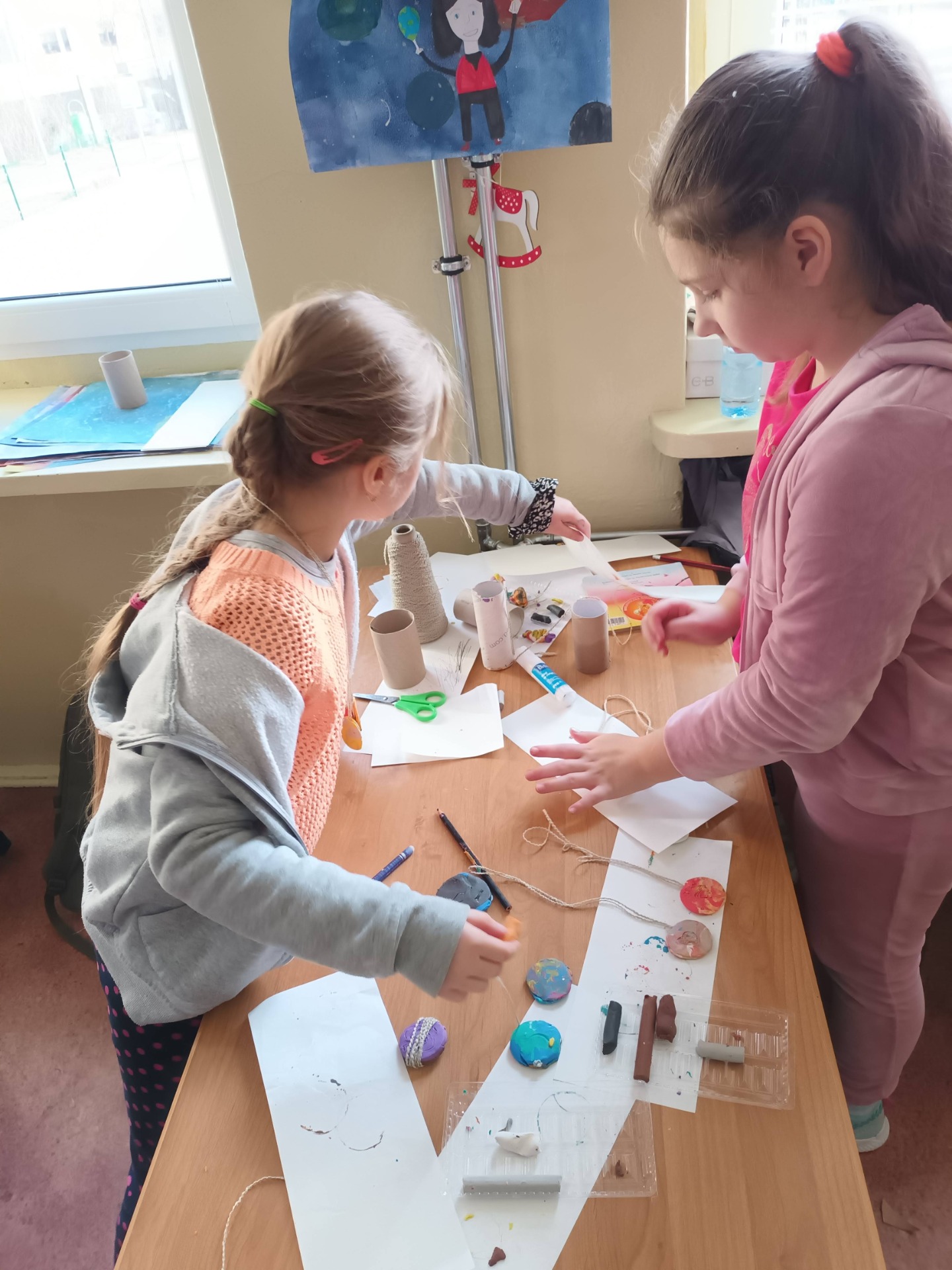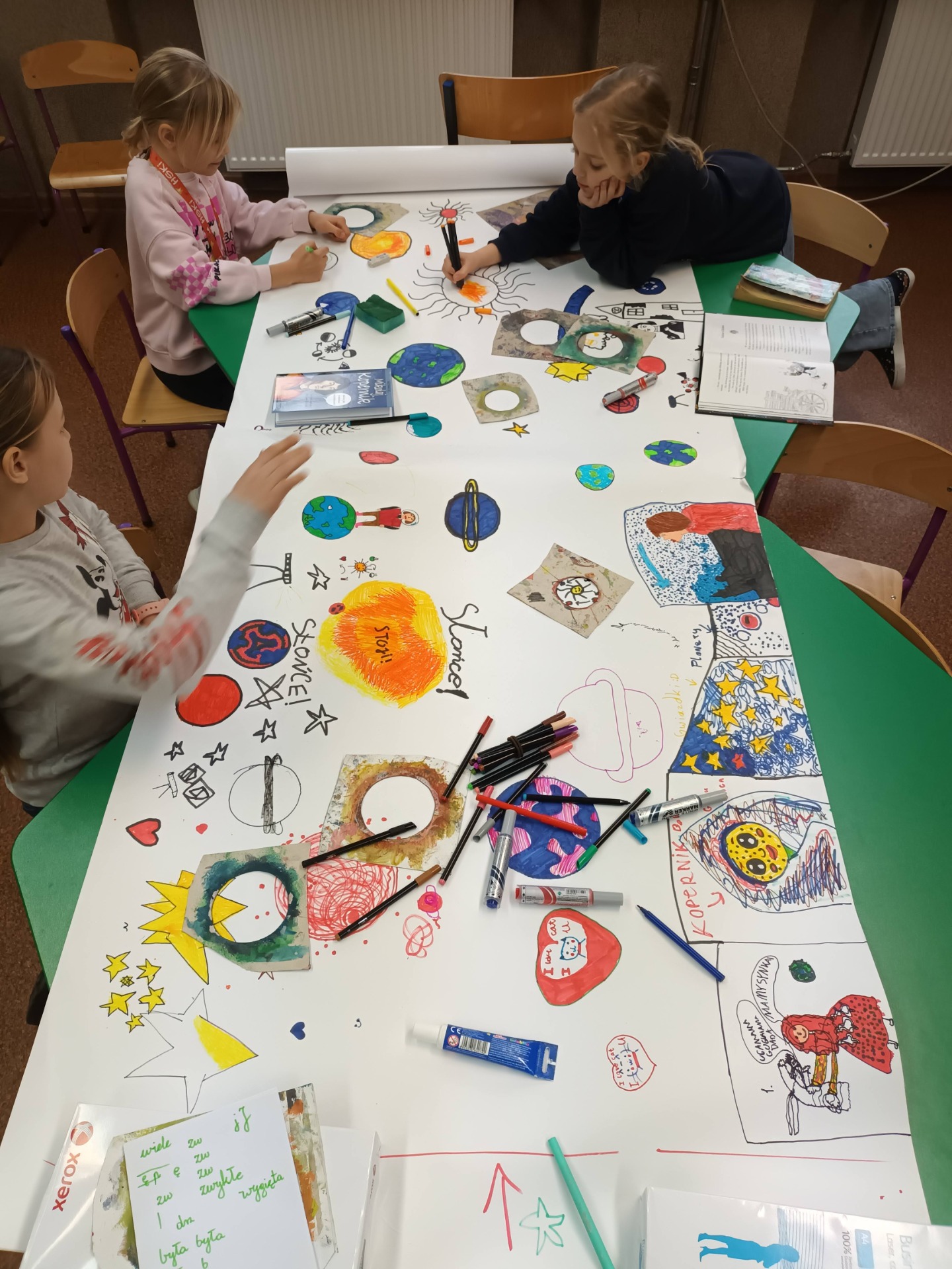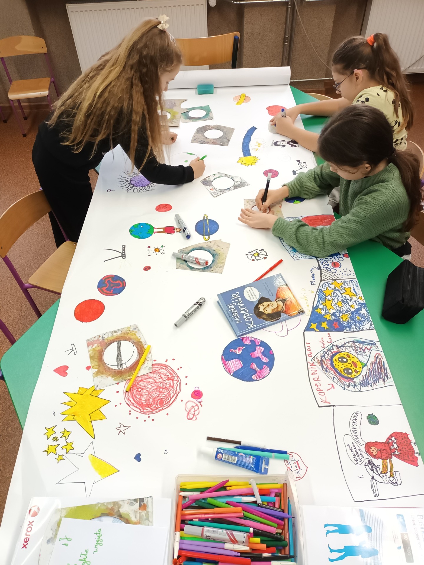 550 rocznicę urodzin naszego patrona świetliczanie uczcili różnymi działaniami - wykonaliśmy medale z plasteliny, scenografię na przedstawienie, prace plastyczne o patronie, wielki komiks o Mikołaju Koperniku oraz dekorację sali - kosmiczne pierniki.