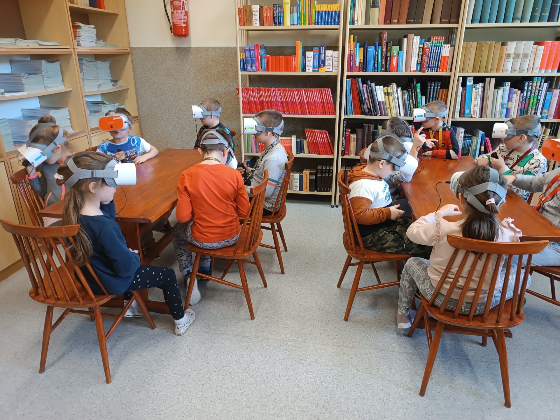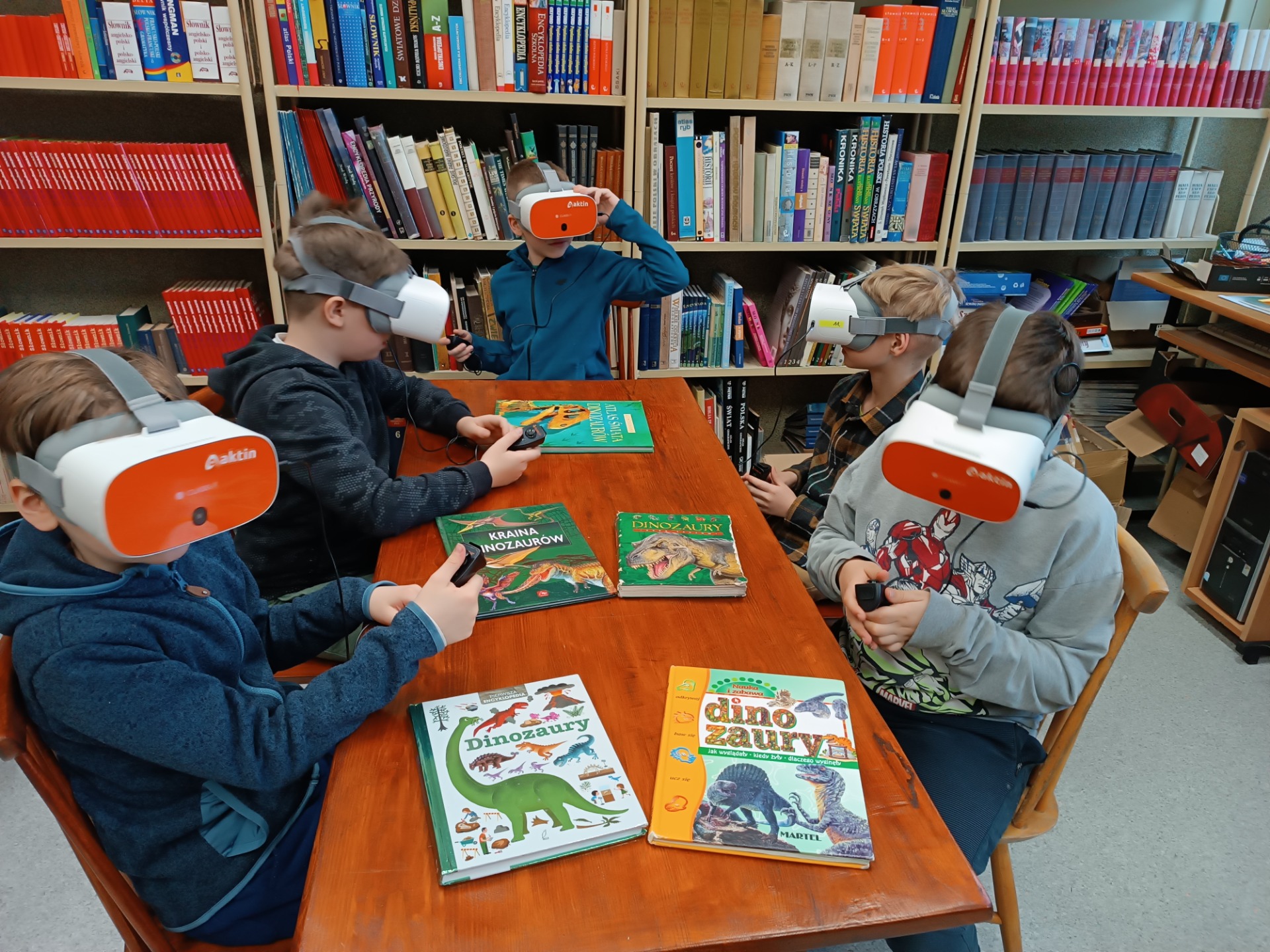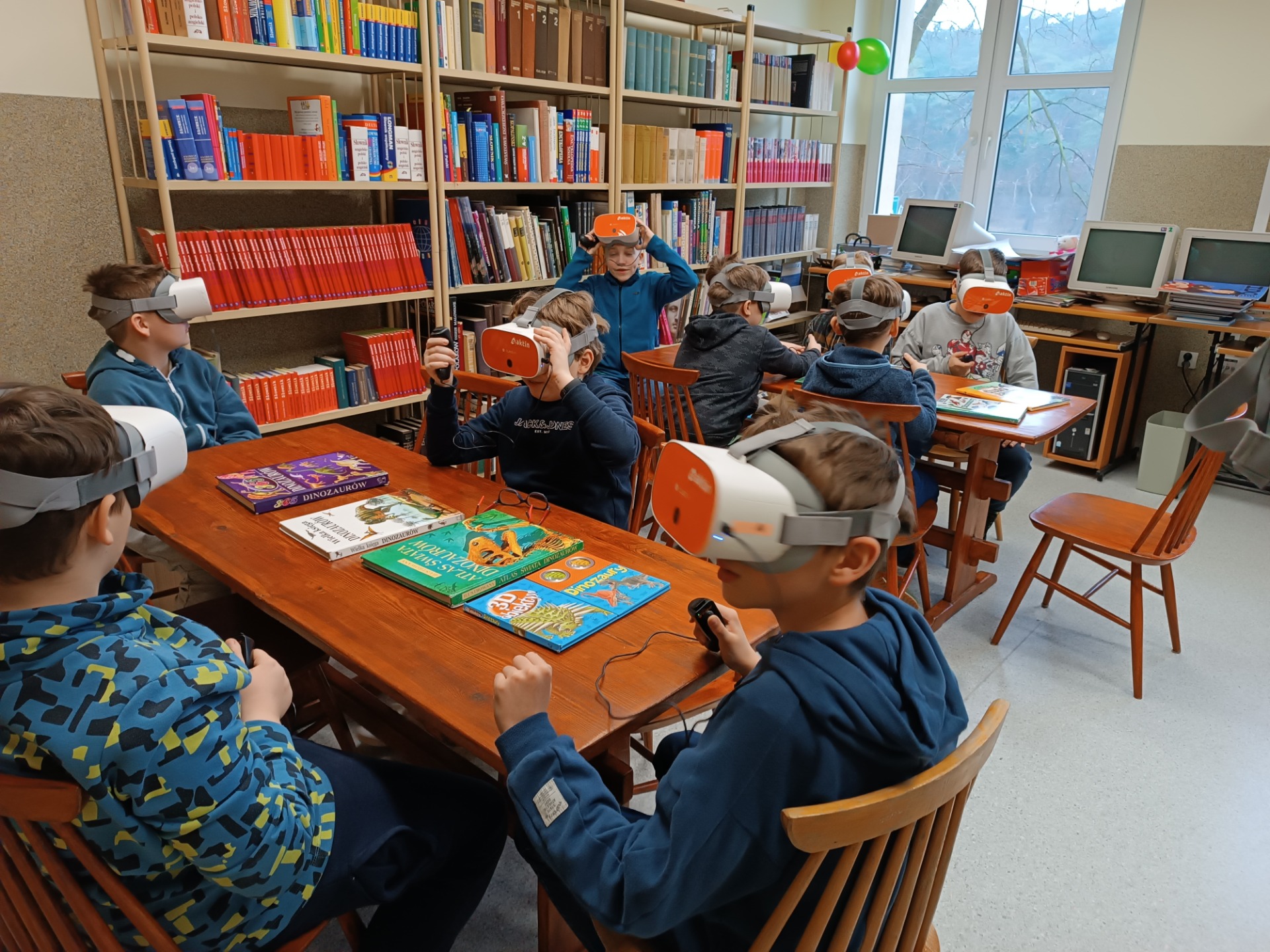 W ciągu kilku ostatnich dni podczas lekcji bibliotecznych uczniowie wszystkich klas 1-3 uczestniczyli w zajęciach z wykorzystaniem okularów VR 🥽 zakupionych w ramach programu Laboratoria Przyszłości. Podczas zajęć mieli oni okazję przenieść się do okresu kredowego i zobaczyć, jak wyglądał ówczesny świat, jaka roślinność wtedy dominowała oraz jakie gatunki dinozaurów żyły na Ziemi 🦖🌳🦕. Uczniowie zapoznali się również z wystawą 📚 książek o dinozaurach i z niecierpliwością czekają na kolejne zajęcia z okularami VR . Zajęcia przebiegły sprawnie pod względem technicznym dzięki pomocy pana Łukasza Dernogi, nauczyciela świetlicy.