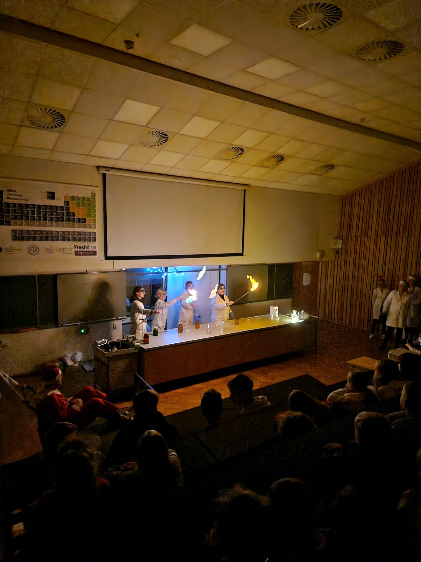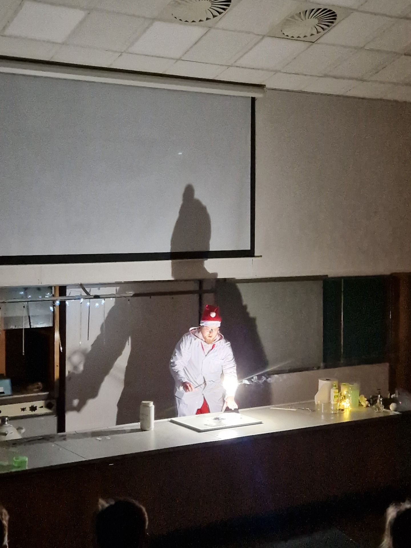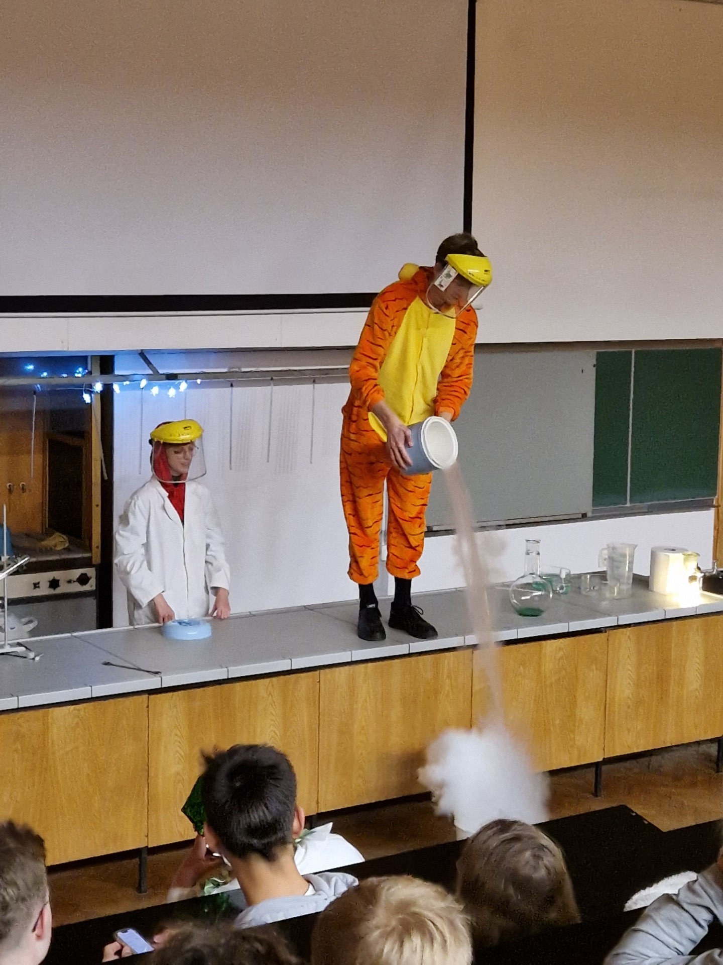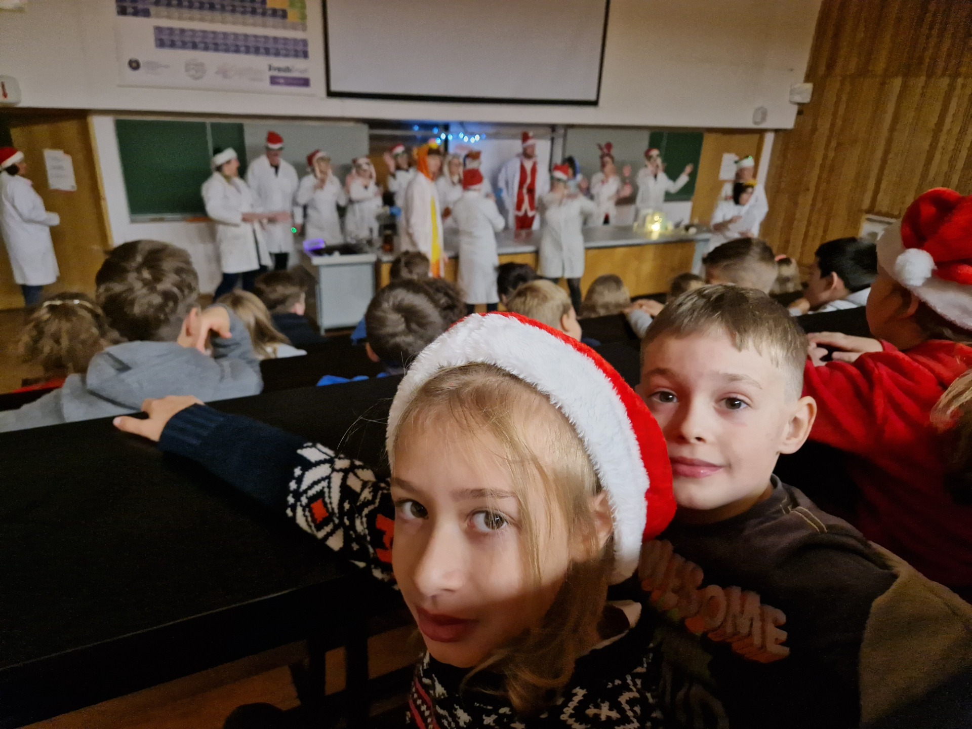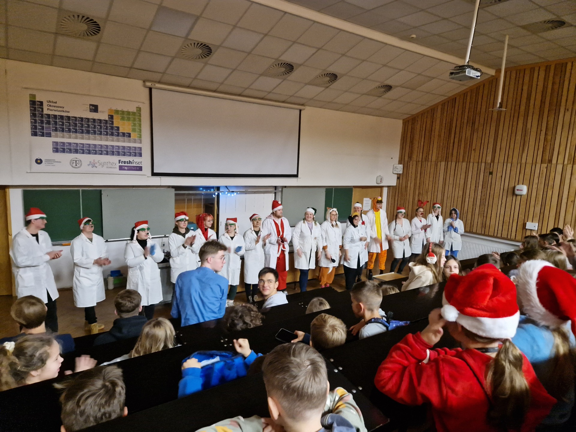 Klasy 1C, 2A i 2B uczestniczyły w mikołajkowym pokazie chemicznym pt. "Chemiczna opowieść świąteczna". Pokaz zorganizowali studenci ze Studenckiego Koła Naukowego Chemików z Uniwersytetu Mikołaja Kopernika w Toruniu. Chemiczna magia, ognie i wybuchy sprawiły, że opowieść o zaginionym Mikołaju była niepowtarzalna i bardzo emocjonująca. Nasi uczniowie wrócili do szkoły zadowoleni i zachęceni do dalszego poznawania tajników chemii.