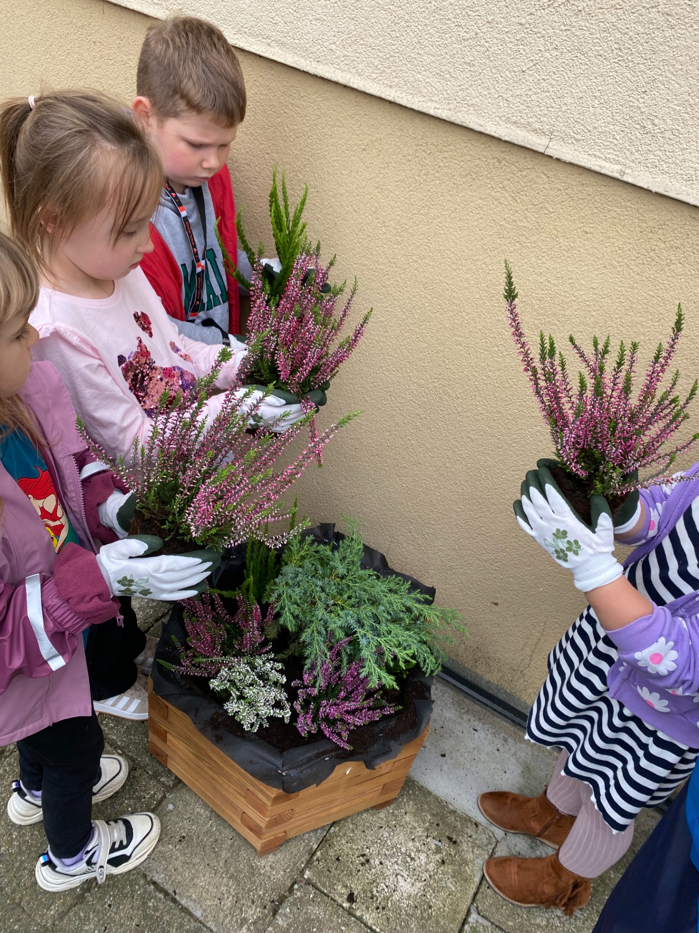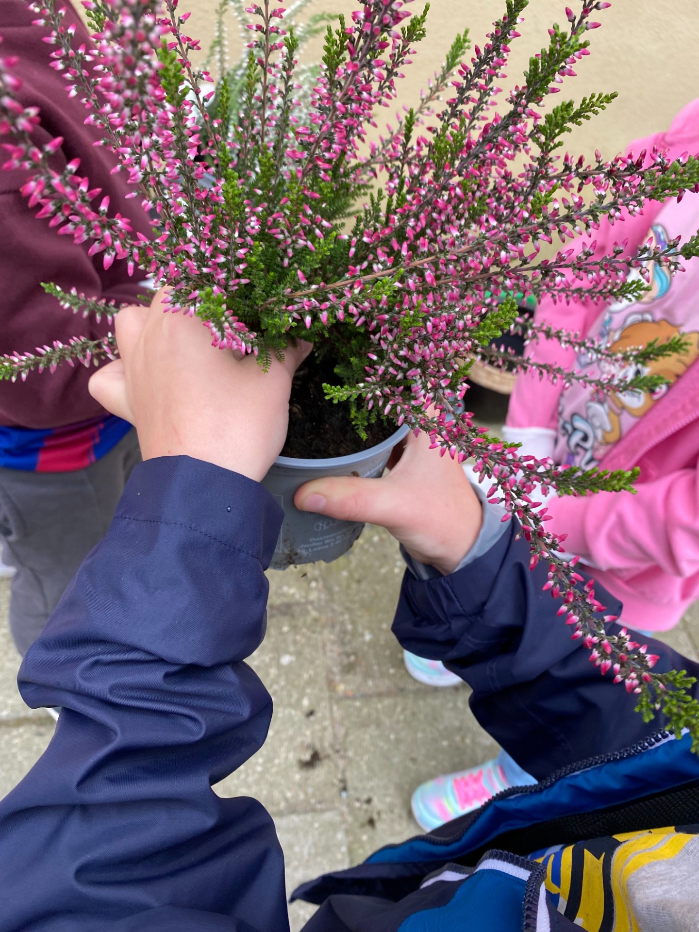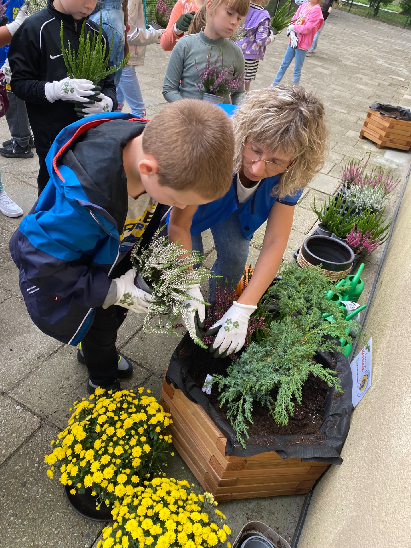 Wspólnie z dziećmi sadziliśmy kolorowe wrzosy, krzew jałowca oraz chryzantemy w donicach przed szkołą.