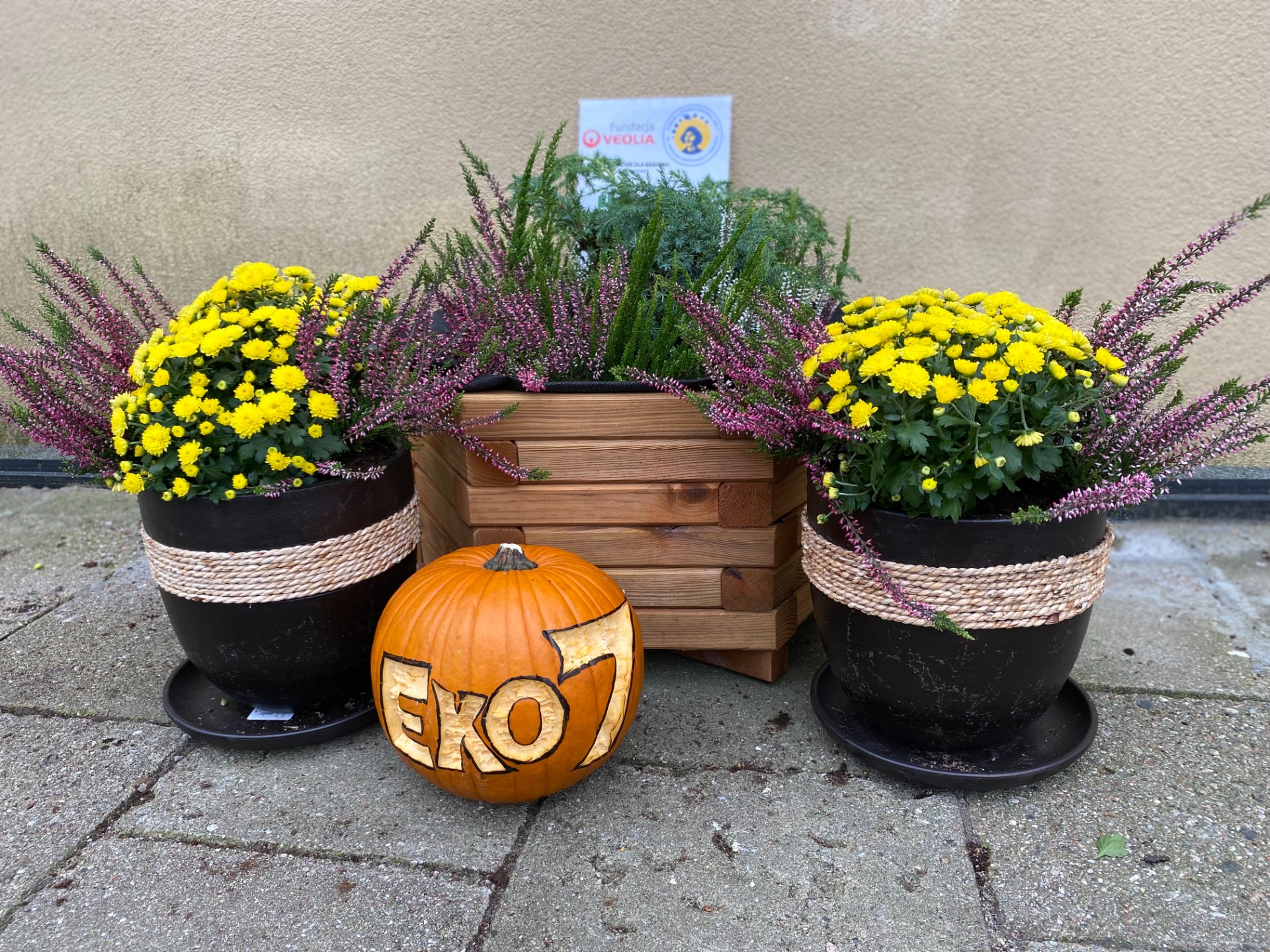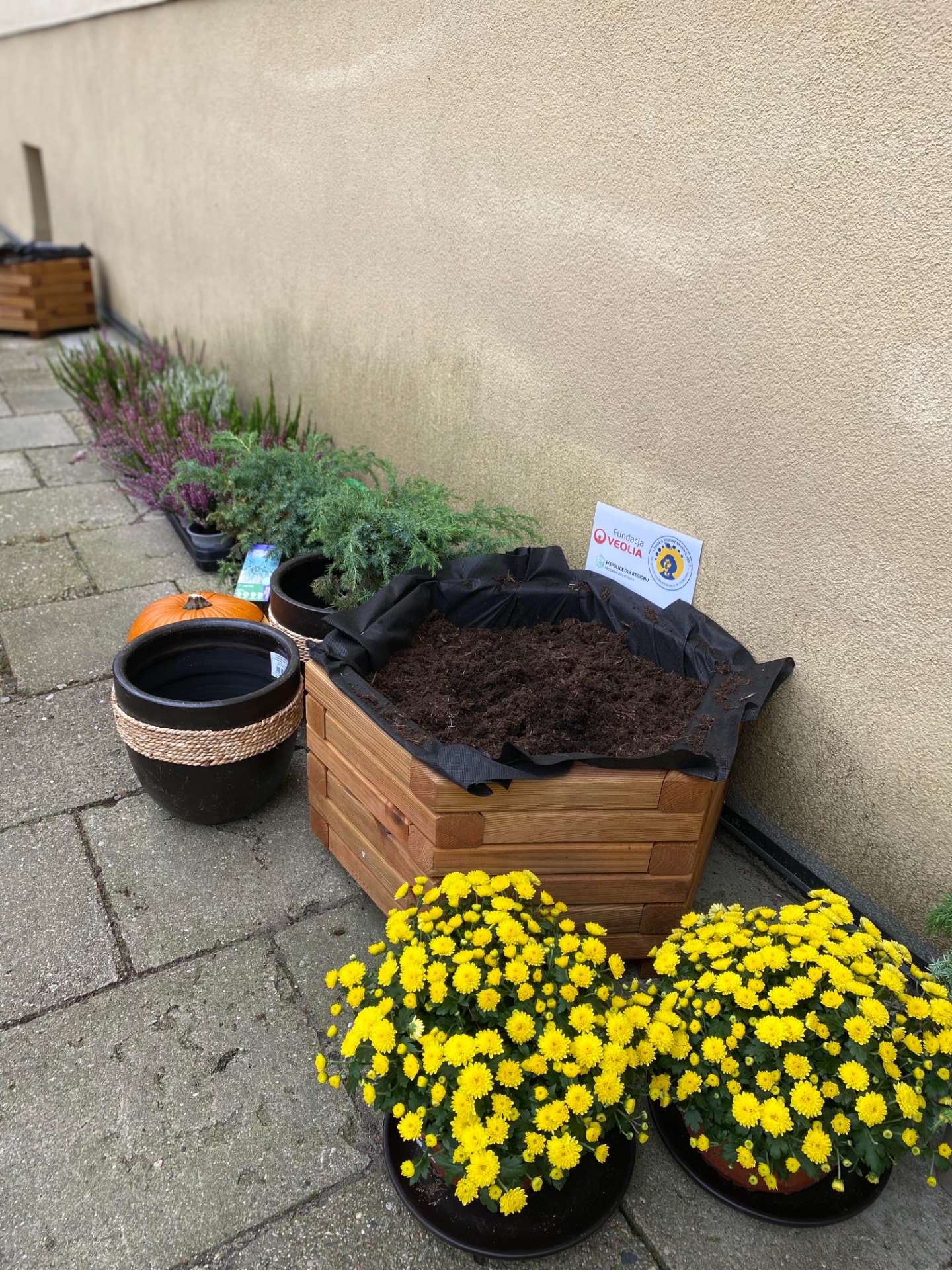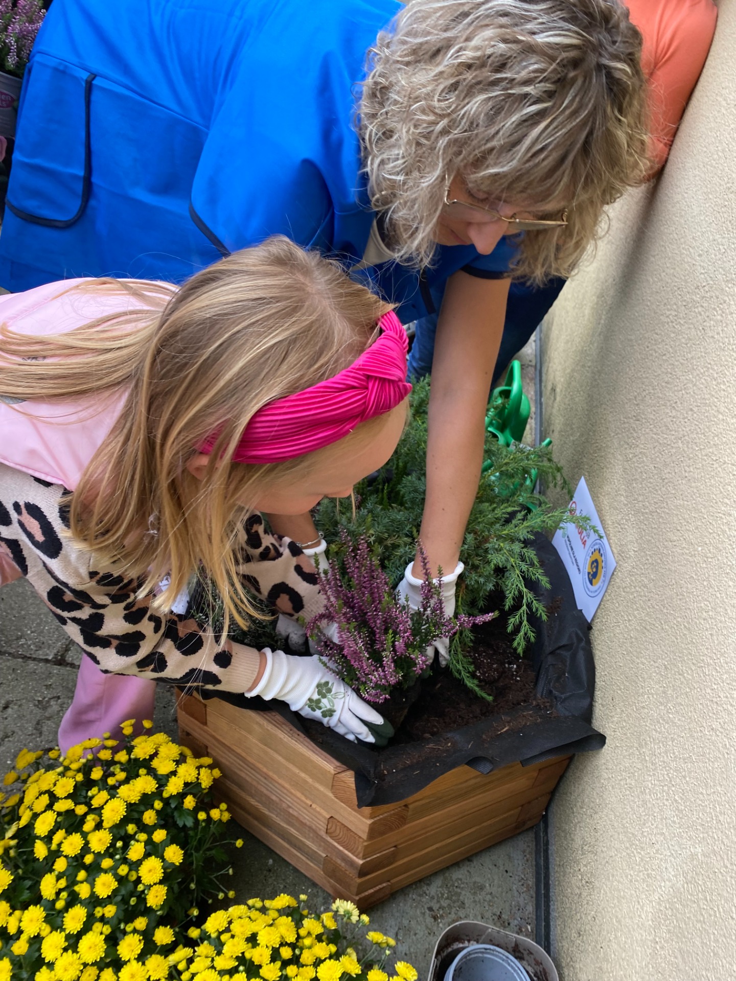 Wspólnie z dziećmi sadziliśmy kolorowe wrzosy, krzew jałowca oraz chryzantemy w donicach przed szkołą.