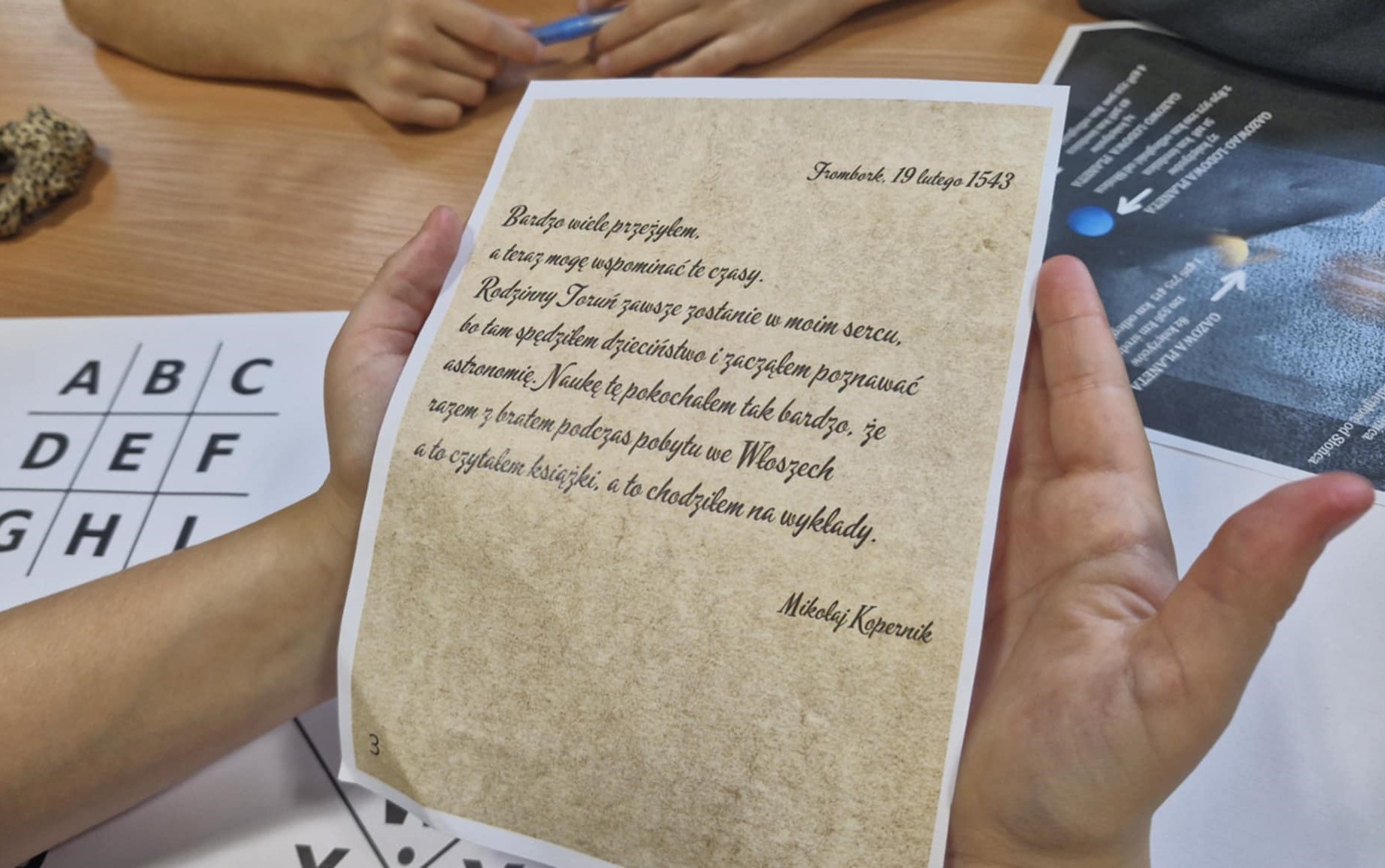 W piątek 19 września w ramach Weekendu na Szlaku Kopernikowskim Międzynarodowe Centrum Badań Kopernikańskich UMK zorganizowało escape room "Tajemniczy skarb Kopernika", z którym zmierzyły się klasy 8b, 5b i 4b. Na uczniów czekały szyfry, ukryte wskazówki i łamigłówki logiczne. Była to dobra zabawa, ale też okazja do rozwijania umiejętności pracy zespołowej i kreatywnego myślenia. Dziękujemy za interesujące zajęcia!