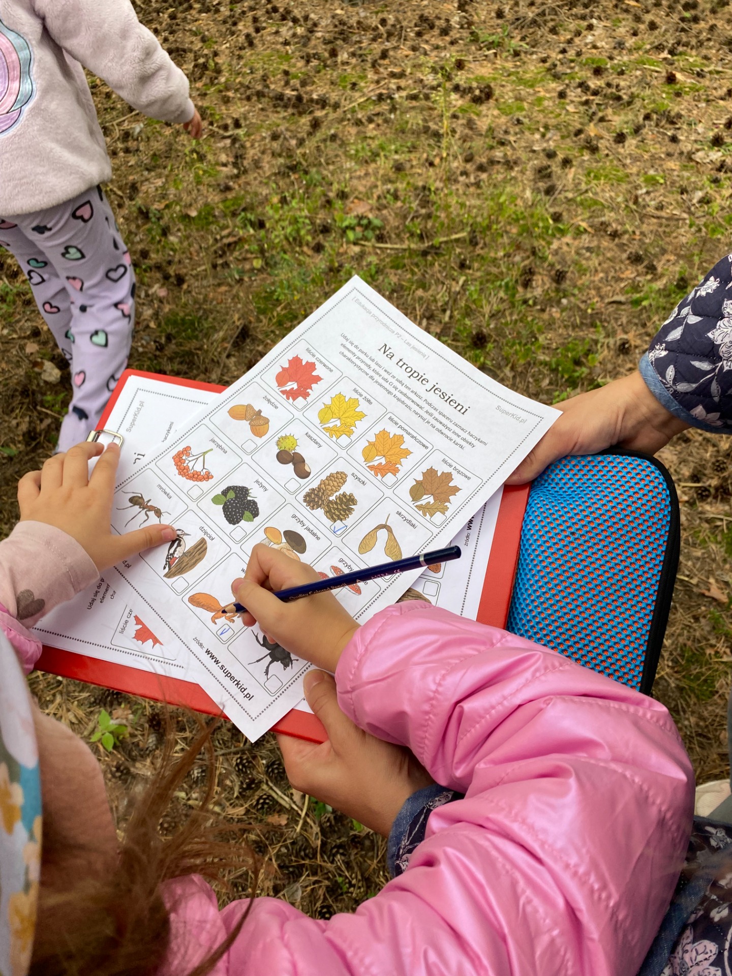 Uczniowie mieli karty pracy z najważniejszymi atrybutami jesieni, których szukali z ogromnym zaangażowaniem.