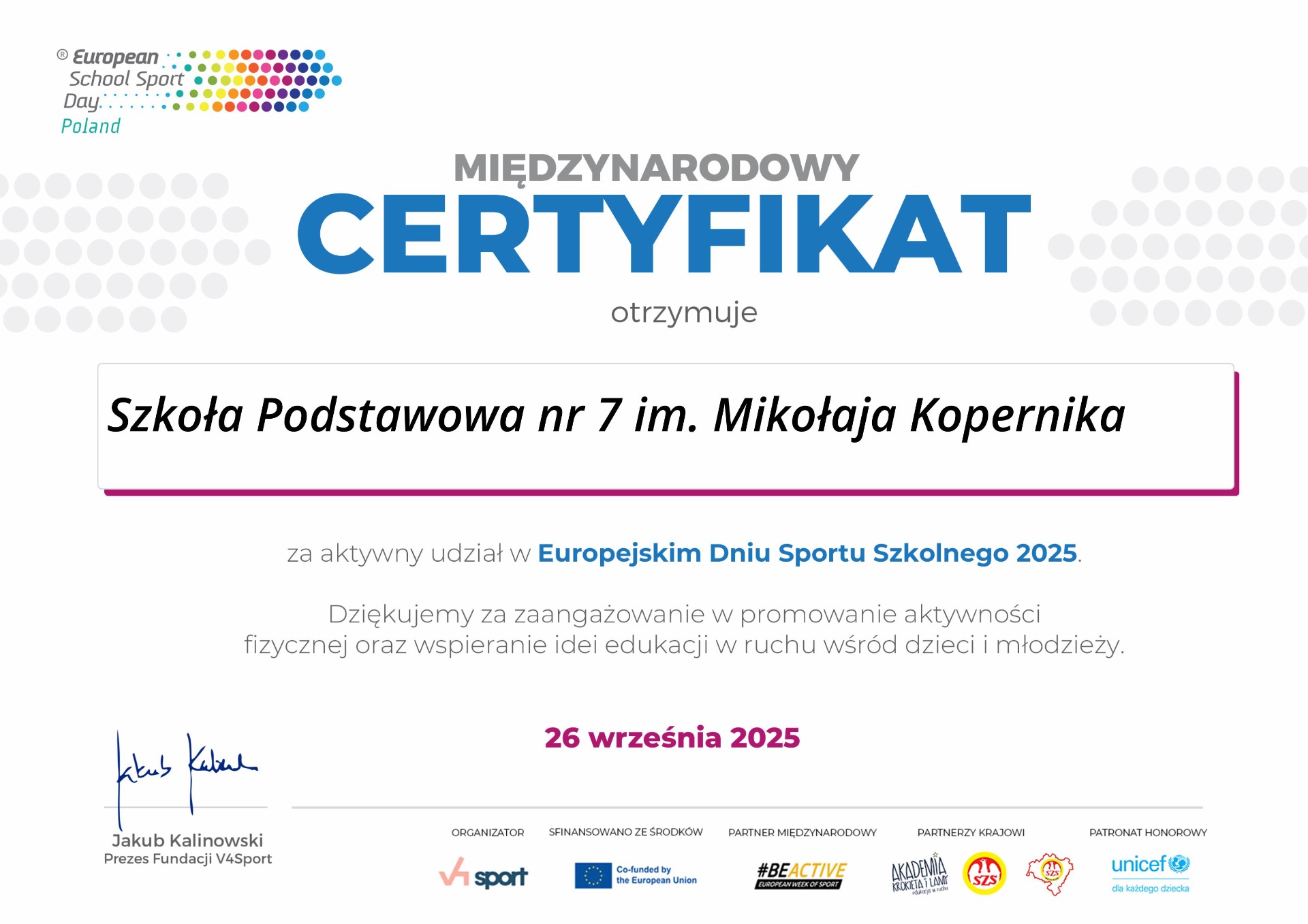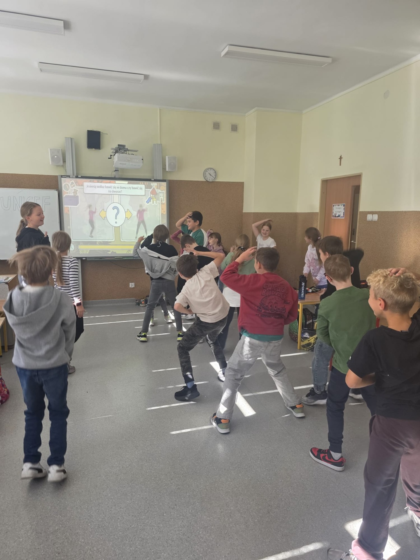 Nasza szkoła kolejny już raz wzięła udział w obchodach Europejskiego Dnia Sportu Szkolnego pod patronatem UNICEF. W klasach 1a, 3b i 3c uczniowie wzięli udział w sportowych przerywnikach lekcji w postaci Freeze dance i Just dance na lekcjach języka angielskiego. Natomiast uczniowie klasy 2c i 3c aktywnie uczestniczyli w zajęciach sportowych Akademii Krokieta i Lamy. W klasach szóstych zorganizowano gry i zabawy z piłką koszykową, takie jak "Dwa ognie", tor przeszkód, "Podaj i rzuć" (ćwiczenie podania i rzutu do kosza), "21" (gra punktowa) oraz sztafety z kozłowaniem i rzutem, aby zachęcić do aktywnego spędzenia czasu i nauki podstaw koszykówki.