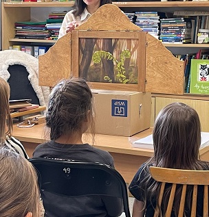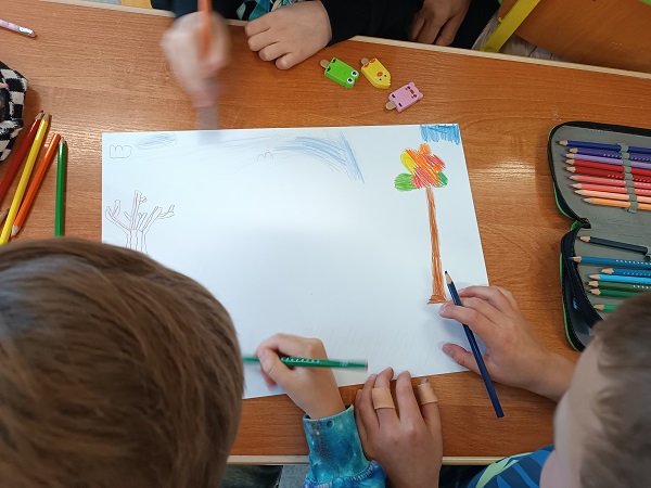 W ramach realizacji projektu "EkoSiódemka - szkoła w rytmie transformacji ekologicznej" odbyła się lekcja otwarta dla nauczycieli. W lekcji pt:"Jak żyje Ziemia? Wędrówka przez cztery pory roku z teatrzykiem kamishibai" wzięła udział klasa 2c. Uczniowie poznali historię teatrzyku kamishibai oraz wysłuchali poetyckiego tekstu ukazującego cykliczność przyrody i życia jej najmniejszych mieszkańców w cyklu dobowym i rocznym. Następnie uczniowie wymienili zwiastuny jesieni oraz sformułowali pytania dotyczące tej pory roku. Na podstawie usłyszanej historii opowiedzieli jakie zmiany możemy zaobserwować w świecie zwierząt jesienią. Kolejnym zadaniem uczniów było zaprojektowanie własnej karty kamishibai na podstawie inspiracji obejrzanej na lekcji.