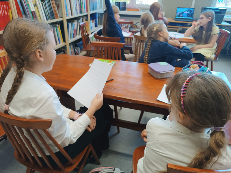Podczas zajęć uczniowie poznali także odnawialne źródła energii oraz ich możliwości wykorzystania w codziennych sytuacjach. Dodatkowo przygotowywali karty do obrazkowego słowniczka z ekologicznym słownictwem — dzięki temu w kreatywny sposób utrwalili nową wiedzę. 🌍💡