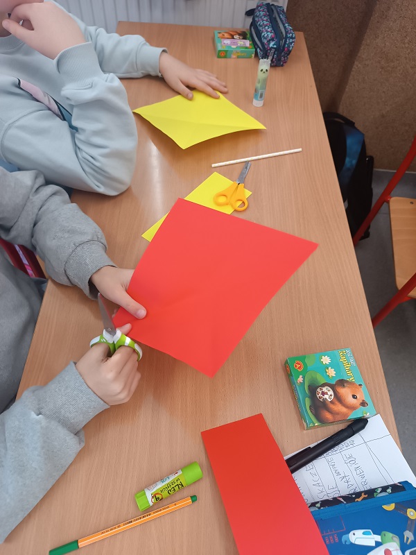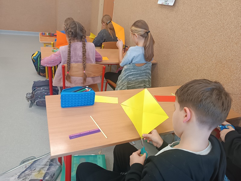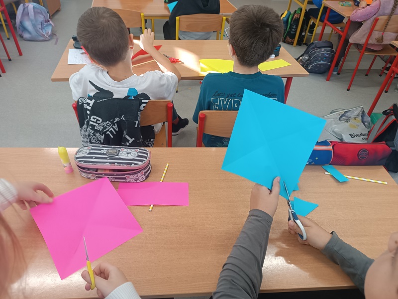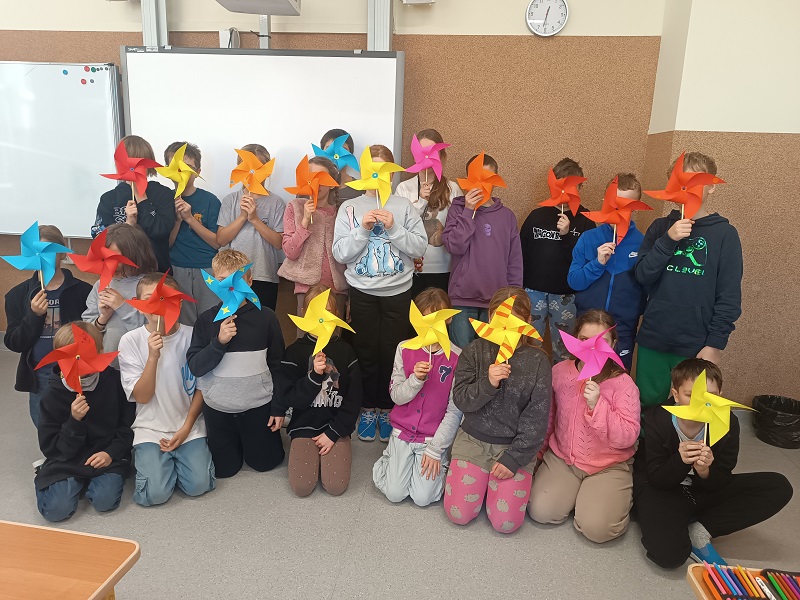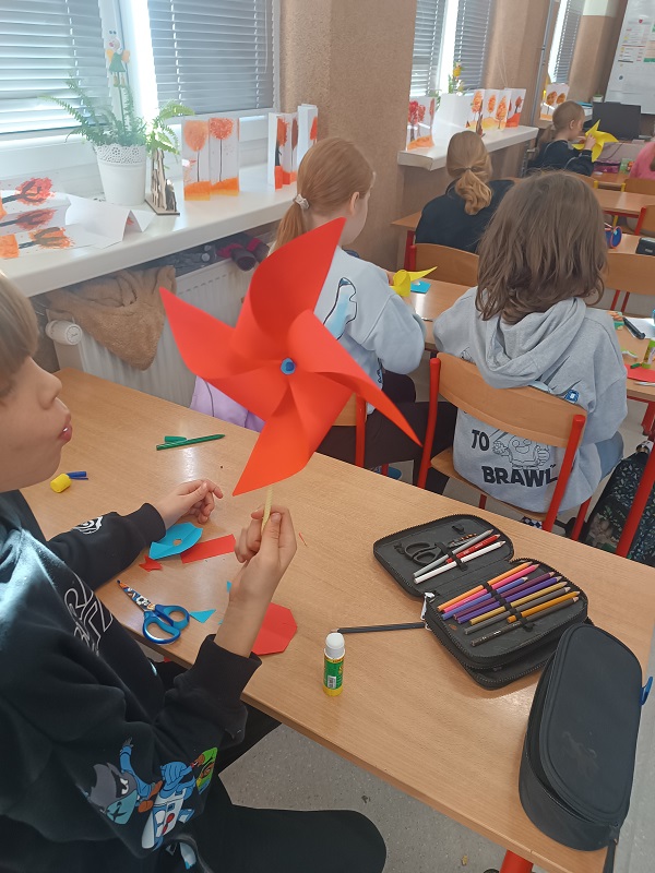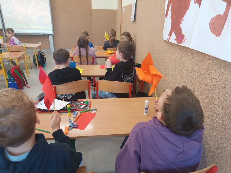 Kolejnym punktem zajęć było wykonanie kolorowych wiatraków z papieru, słomki i pinezki — oczywiście zgodnie z instrukcją nauczyciela. Każde dziecko mogło udekorować swój wiatrak według własnego pomysłu, dzięki czemu powstały prawdziwie wyjątkowe prace.