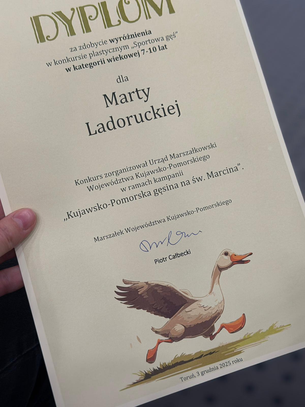 Uczennica kl.2 a Marta Ladorucka otrzymała wyróżnienie w konkursie ,,Sportowa gęś" , którego organizatorem był Urząd Marszałkowski Województwa Kujawsko - Pomorskiego..