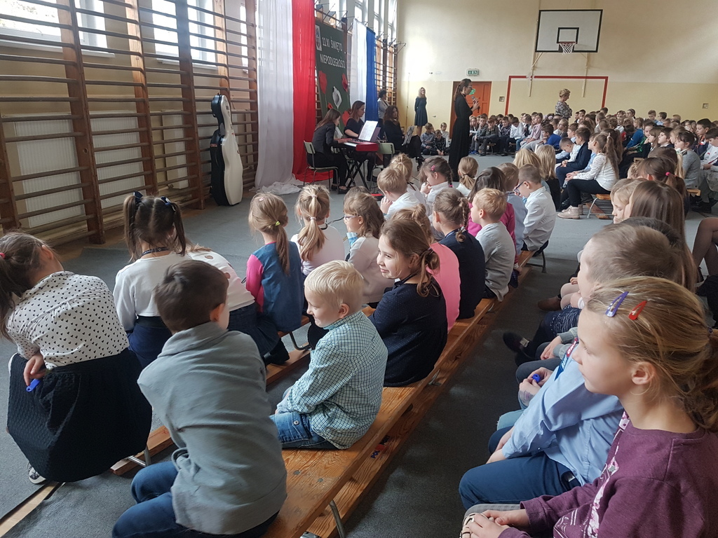 Klasy pierwsze podczas szkolnych obchodów Święta Niepodległości.